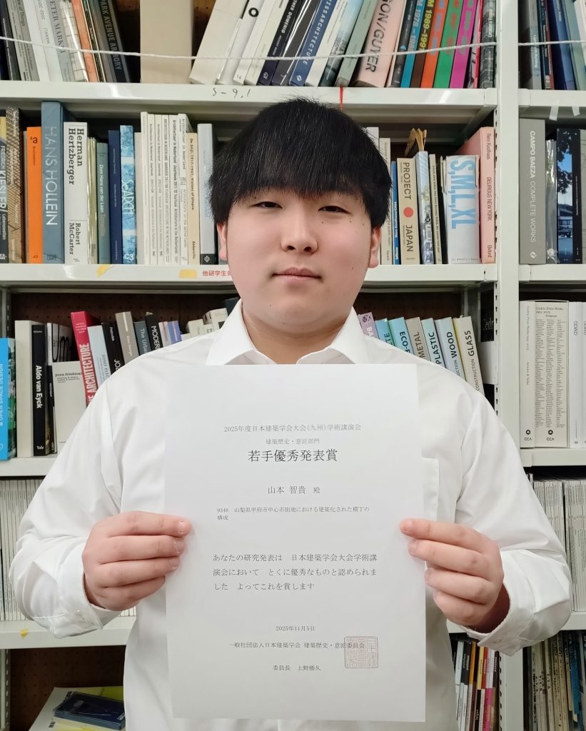 【受賞】工学研究科建築学専攻の山本智貴さん(中井・鈴木研究室)が「2025年度建築学会大会学術講演会(建築歴史・意匠部門)若手優秀発表賞」を受賞
